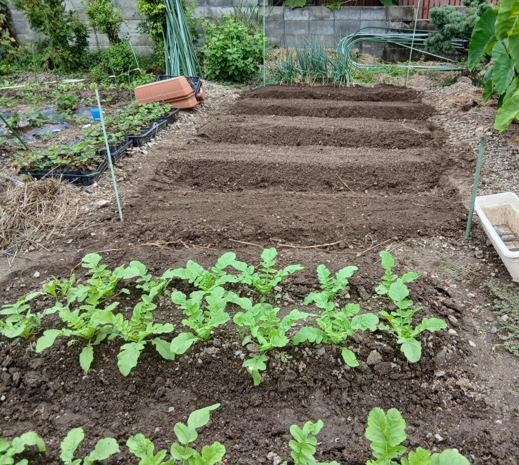 青首大根かなり間引いたのですが、まだ結構混みあってます。真ん中の一列は「おでん大根」が伸び、あと一回間引けば終わりの予定。大根大雨でかなり虫も発生したので、大根の葉が途中から切れたり、枯れてます。空いているところに、余った大根の種、蒔いてみました。