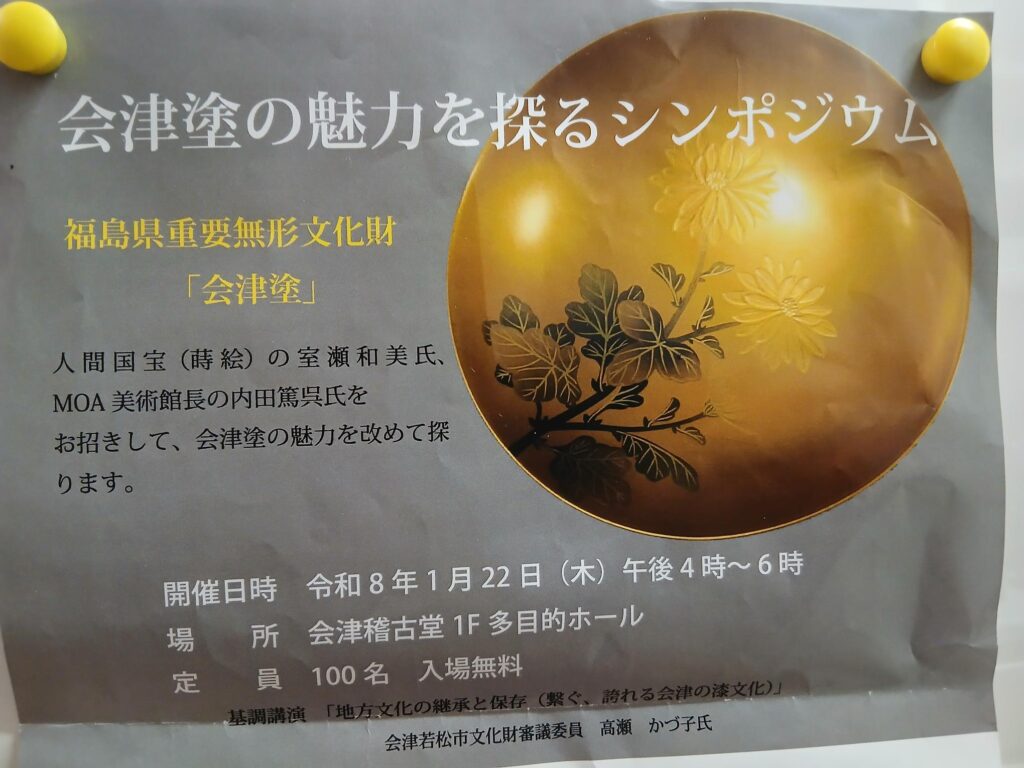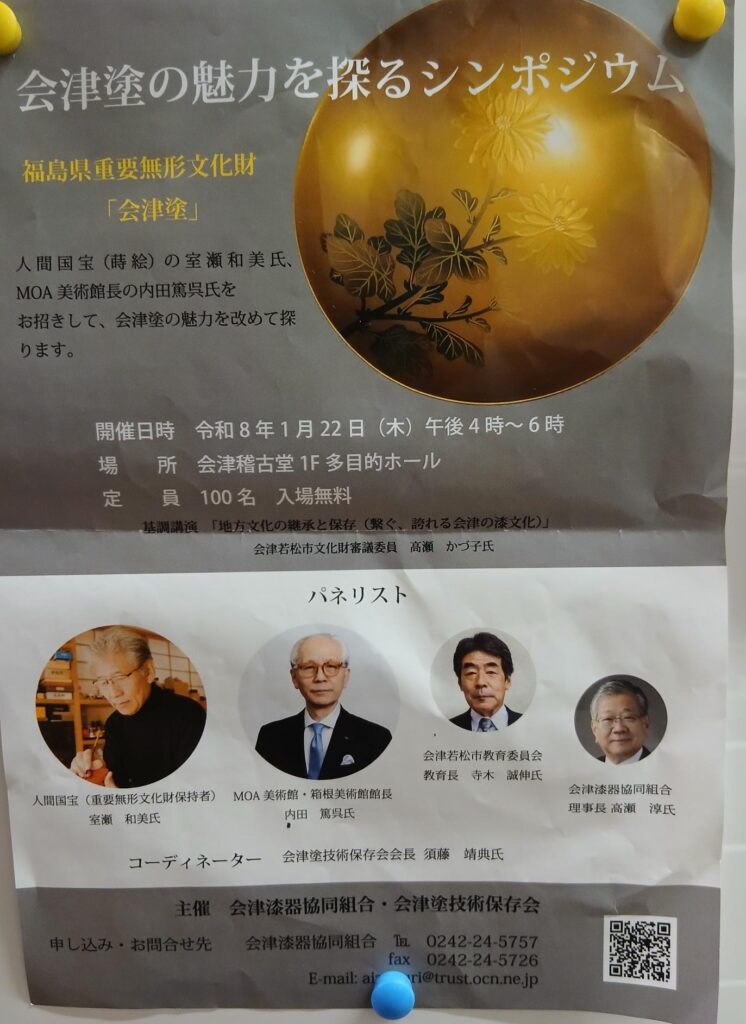 会津塗の魅力を探るシンポジウム R8.1.22会津稽古堂by 大森工房だより投稿日: 2026年1月22日コメントを受け付けていません 基調講演 高瀬かづ子氏の「誇れる会津の漆文化」会津漆器の特色は?と聞かれて一口で返答することは難しく、あれもこれも話したくなる私ですが、聞く方は簡単で分かり易い説明を期待しているのです。今回 会津漆器の蒔絵の技法 いろいろありますが、会津の先人の方々が、工夫され立派に確立なさった平極蒔絵・消蒔絵技法 消金地‥等 400年前からの今日までの歴史 短時間でお話なさり、改めて会津塗の魅力再確認出来ました。雪舞う厳しい寒さの中大勢の方々が集まり熱心にお聞きしました。 パネリストの方々 厳しい雪の中会津まで遠路お越し下さりありがとうございました。人間国宝の室瀬和美氏工芸のテレビで拝見しますが、会津稽古堂で参加者の皆さんに分かり易い語り方 「一人一人が漆器の良さを一対一で、まず話すことから始めることが大事!徐々に広がる・・・我が家は20年前から漆器の飯椀つかってますが会場で、「漆器の飯椀使っている人 手を挙げて・・・」と、 飯椀は暖かいご飯を終わりまで食べれる。お茶碗では冷たくなってしまう」と具体的に話され、飯椀・汁椀の良さお客様に勧めたいと思いました。パネリストの皆様お疲れさまでした。準備なさった会津漆器組合・会津塗技術保存会の皆様ありがとうございました。