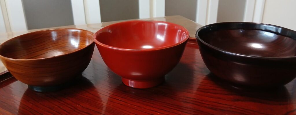 漆塗り飯椀 令和8年1.28by 大森漆K・studio投稿日: 2026年1月29日2026年1月30日コメントを受け付けていません 我が家で毎日使ってます飯椀です。ちょっと小ぶりですが軽く盛って丁度良い量です。毎日使っている飯椀と新しい飯椀を比べたらはっきりわかるように、洗って木綿の布きんで良く拭き取るのでいつの間にか漆艶光沢が綺麗です。使用後傷をつけないようにごちゃごちゃ一緒にしないでお椀漆器等分けて洗えば大丈夫。漆塗りの変化も楽しみです。 右がおすすめの飯椀。重さ:103g 喜多方市在住の飯野木工所さんが、喜多方ぶらーりの期間中 マルサ製作所さんで展示していた木地、あと残り2個になったので注文依頼したところ、機械の不具合で一年待ち 今年の年賀状に1月頃仕上がるとのことなので、楽しみに待ってす。 左のお椀は、会津漆器職人の会で発足当時会員同士で考案した形で、最近のものは小椋大輔さんに挽いて頂いたもの ちょっと大振りなのでおかゆ・雑炊・炊き込みご飯に重宝してます。重さ:158g 軽く盛りつけ230g。以前使っていたお茶碗からするとかなり軽くなりました。漆器は直に電子レンジは使えないので、冷たくなったごはん温めるときはお茶碗で温めることもあります。汁椀の重さ:115g 子供用の欅拭き漆のお椀:71g 喜多方市学校給食用のお椀小:127g 左椀:子供用欅拭き漆椀石原木工所木地 中央椀:飯椀 右椀:喜多方市学校給食用 喜多方ぶらりー期間中 喜多方漆器組合会場で購入
