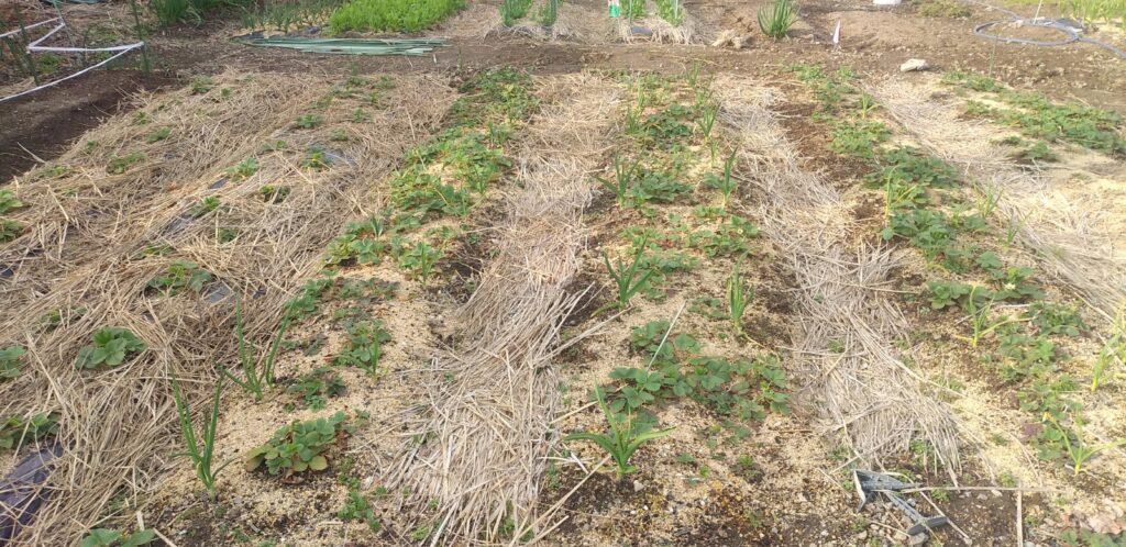 苺の移植 ポットから移したら、どんどん大きくなり、この時期 ツルまで延びライナーの先に新しい苗まで出来てます。この時期のライナー取り除いた方が来春 株が大きくなるのでしょうか?ユーチューブ見ながら学習してみます。イチゴの株間にニンニクも植えたら、芽が伸びてきました。昨年 10個位植えたら結構成ったので、今回20個以上 空いているところに、もみ殻掛けながらわかるように育ててます。マルチしたところはもみ殻 雪降る前にびっしり蒔き、マルチないところにはまずわら敷いてから、もみ殻も蒔く予定。
