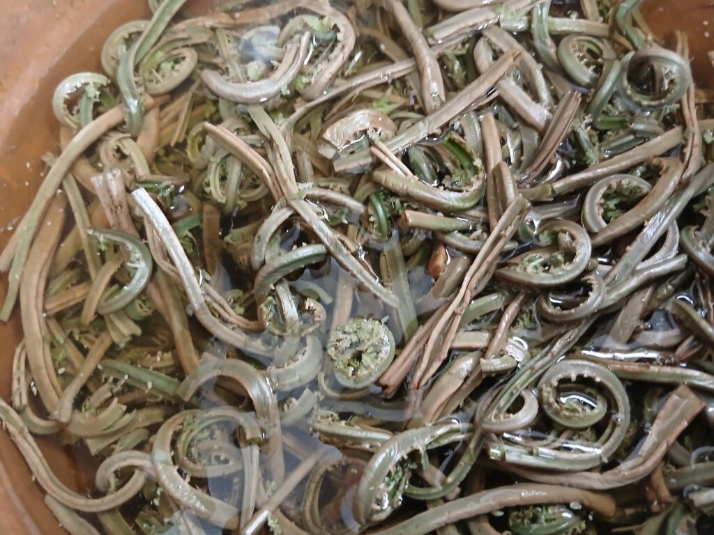 乾燥こごみby 大森漆K・studio投稿日: 2025年10月31日コメントを受け付けていません ゼンマイとはちょっと違うと思いましたが、ゼンマイ同様水から赤鍋に入れて沸騰するまで茹でて戻したら、こごみでした。とても柔らかく、そのままおひたしで食べたり、油揚げ・細竹の子等で煮て美味しく頂きました。乾燥こごみは初めて、これまで揉んで干して保存することは大変な作業と思います。有難く頂きました。