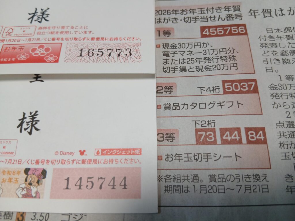 お年玉年賀状 抽選発表R8.1.21by 大森漆K・studio投稿日: 2026年1月22日2026年1月22日コメントを受け付けていません 年々年賀の挨拶状減少して、「我が家も今年で卒業!」することに致しましたが、年の初めのご挨拶、文字を見ながら元気な様子思い浮かべてほっとしたり、何十年も年賀状のやり取りで安否の確認お互いに寂しい限りです。年末になったらその時考えることにします。今年は、もっと文字に親しみ、日記・手紙等 書き慣れたいものです。